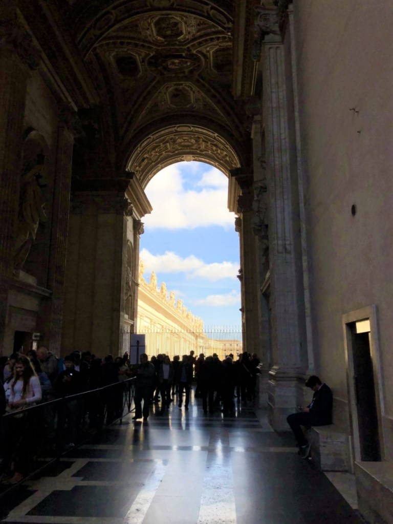 In Angels & Demons, Langdon approaches the Vatican from the air, flying in on a helicopter. He sees the massive Vatican Museum and notes that there would be no time for a museum visit this trip. Lilly and I, on the other hand, approaching on foot through the main entrance, were in for a treat.