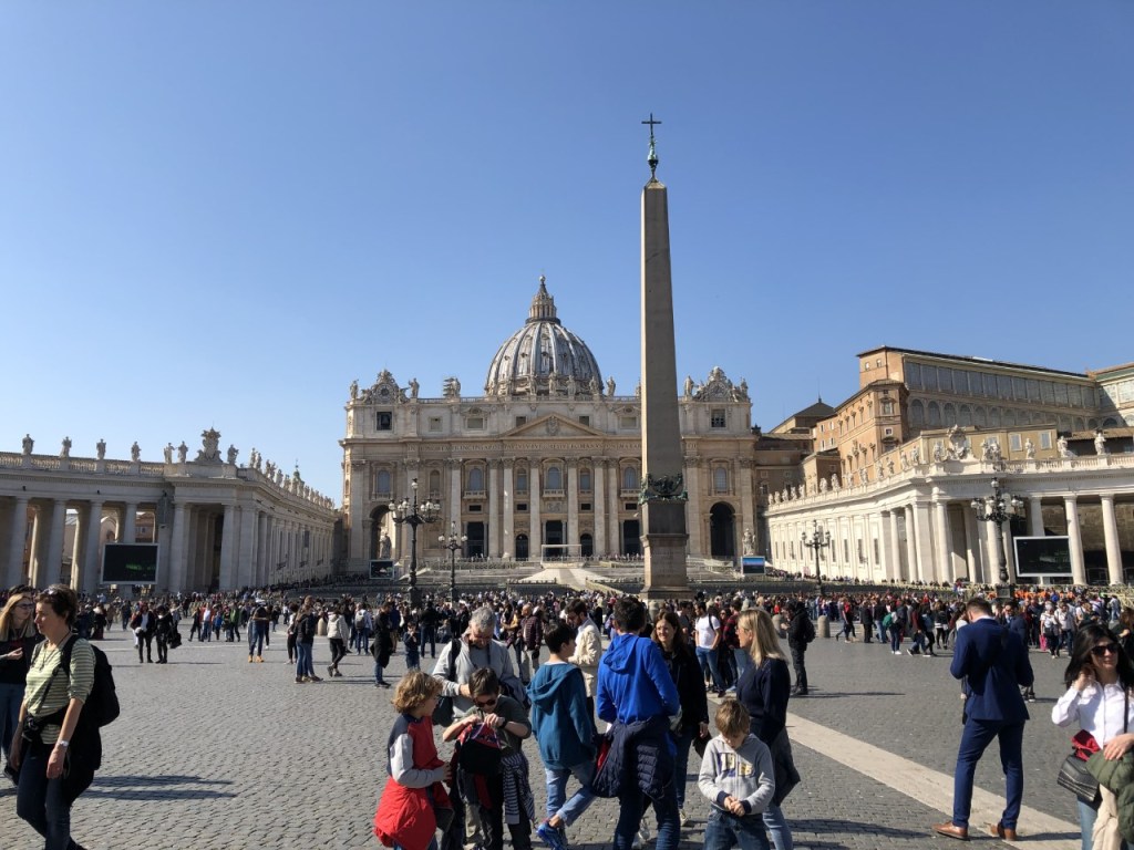St. Peter’s Basilica was the final stop on our guided tour. It is named for St. Peter, a disciple of Christ, to whom Jesus said, “You are Peter, and on this rock I will build my church,” (Matthew 16:18). Translations of “peter” mean “rock” (Greek and Aramaic). Tradition says Peter was martyred here by Emperor Nero for spreading Christian beliefs. Three centuries later, Emperor Constantine, the first emperor to convert to Christianity, built a basilica over the Necropolis where tradition says Peter was buried, with the high altar directly over his grave. On this rock (peter) the basilica is built – literally.